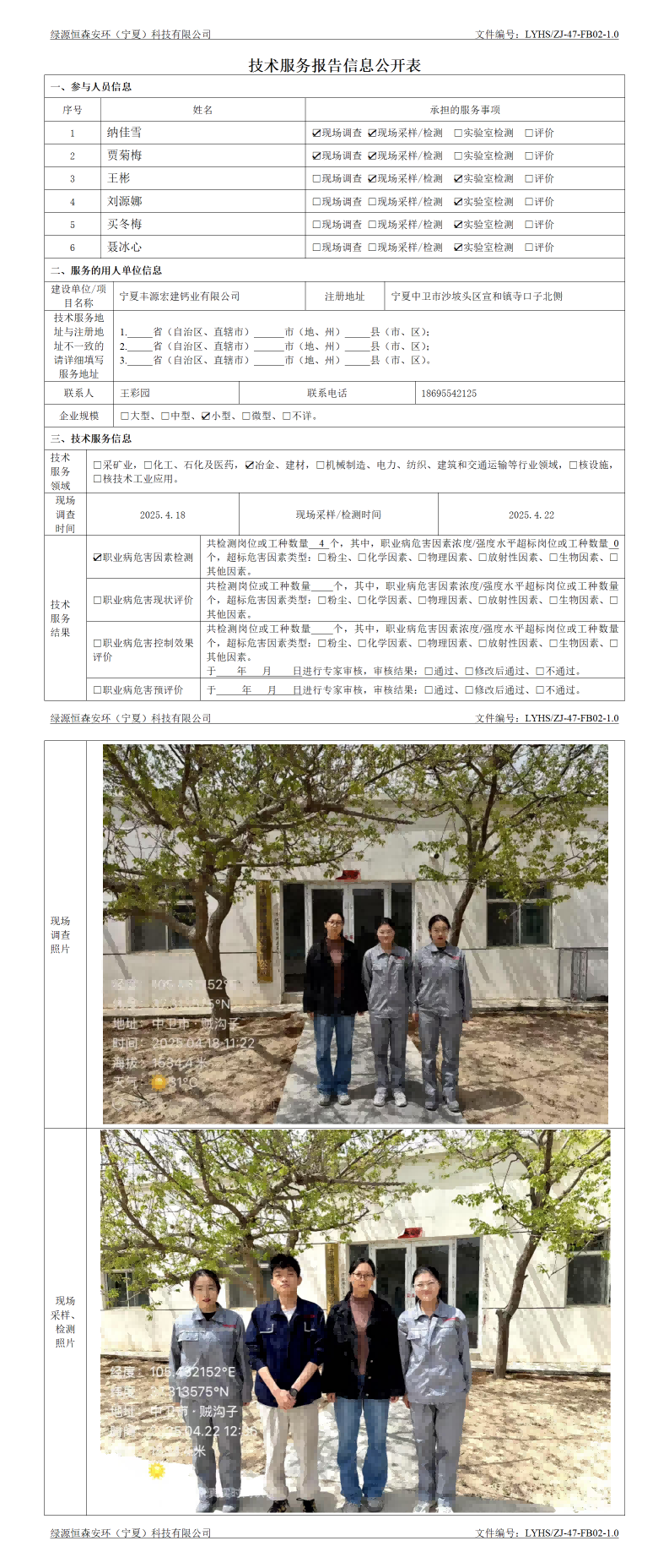 寧夏豐源宏建鈣業(yè)有限公司工作場所職業(yè)病危害因素檢測報告技術(shù)服務(wù)報告信息公開表