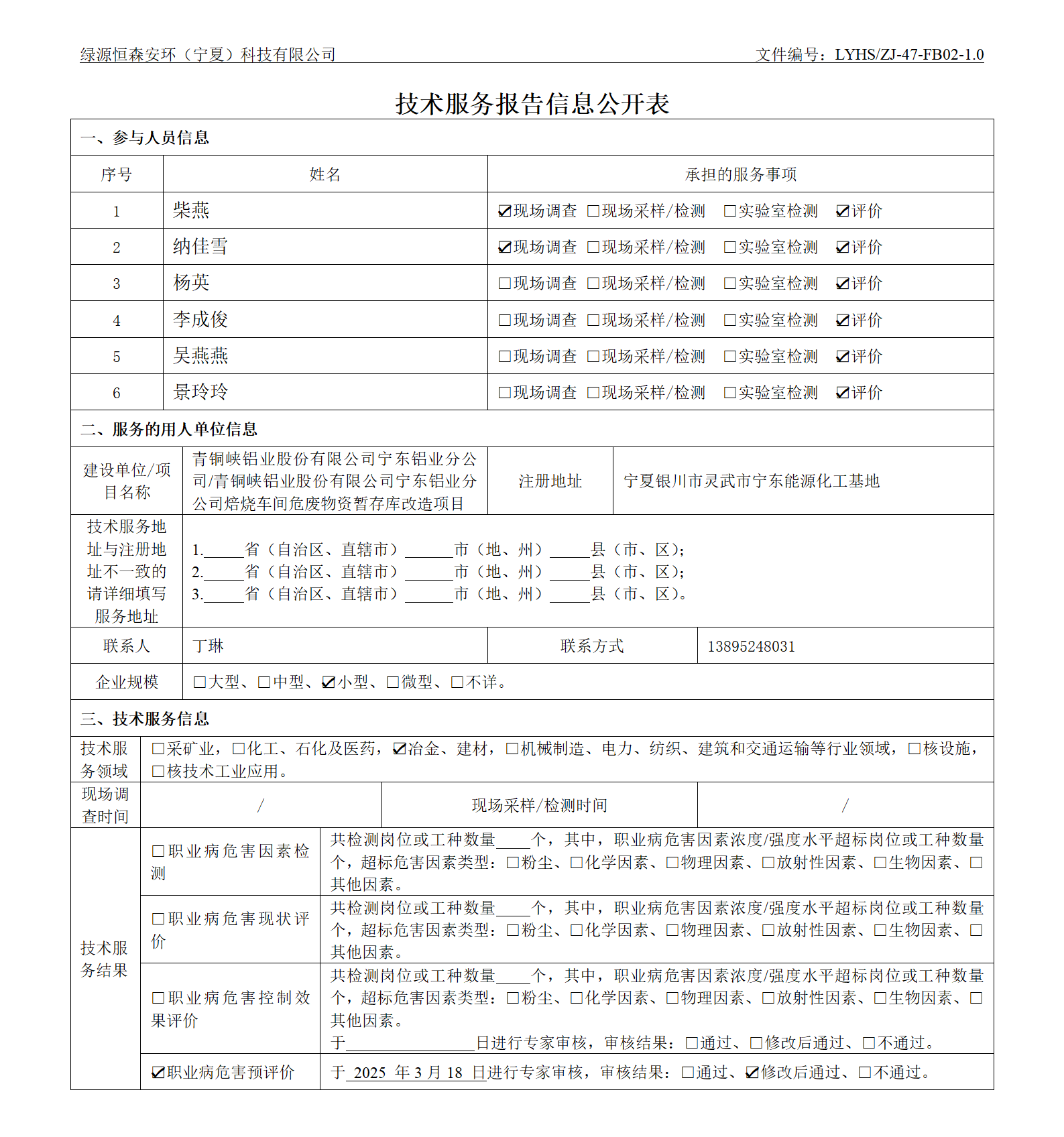 寧東鋁業(yè)分公司焙燒車間危廢物資暫存庫改造項目職業(yè)病危害預評價報告技術(shù)服務報告信息公開表