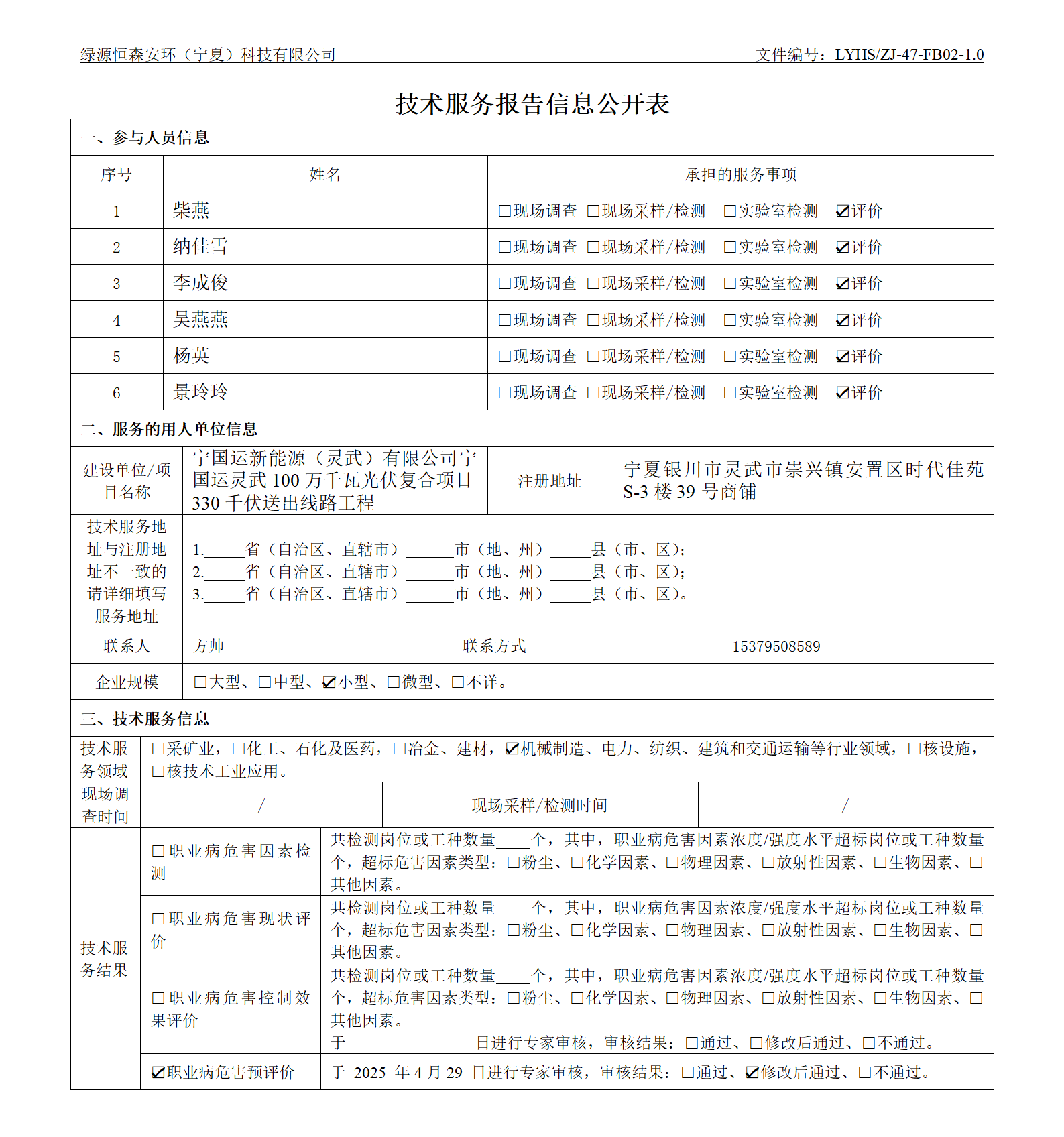 職衛(wèi)預(yù)評寧國運靈武100萬千瓦光伏復(fù)合項目330kV送出線路工程職業(yè)病危害預(yù)評價報告信息公開表